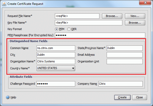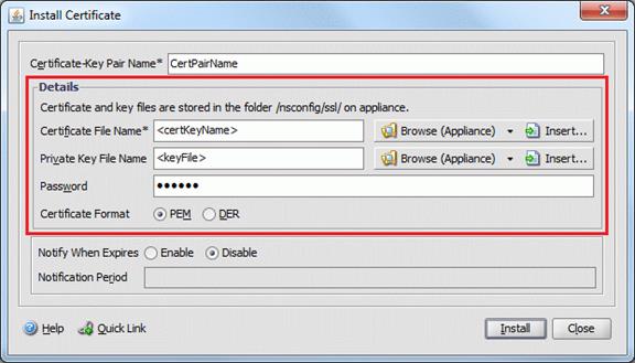 4. In the Details, specify the appropriate files names for the certificate and private key.