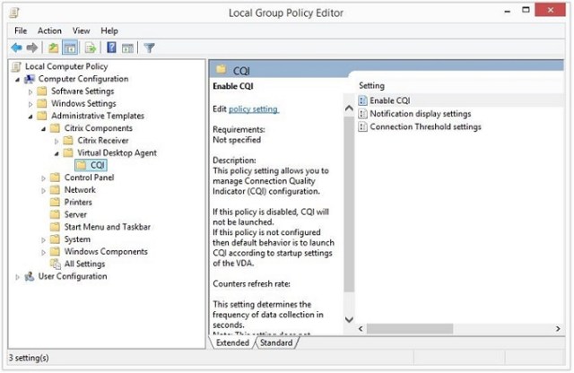 It is recommended to use Windows Group Policy editor to configure CQI. CQI includes administrative templates files (CitrixCQI.admx CitrixCQI.adml) in the installation directory.