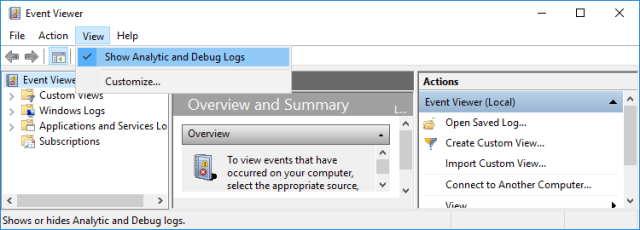 The same logging information is written to Windows Event log. There are two event log channels, Admin and Debug. To see Debug channel, ensure “Show Analytic and Debug Logs” option is enabled.
